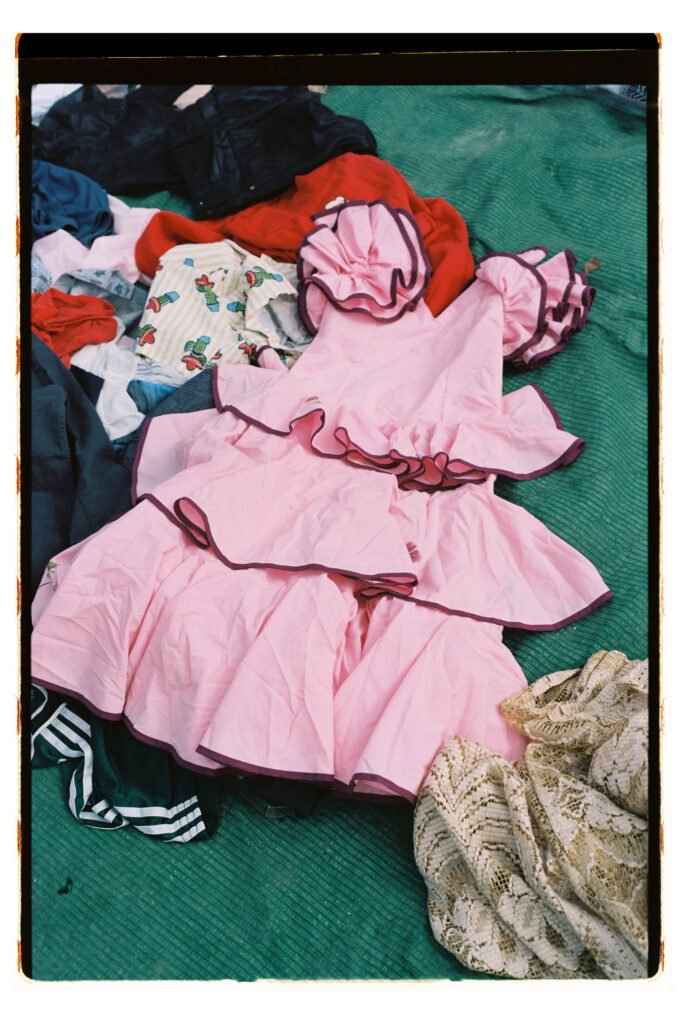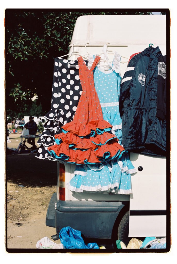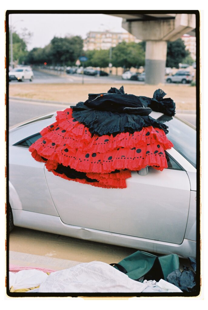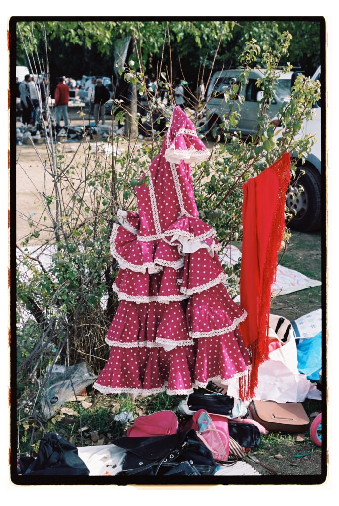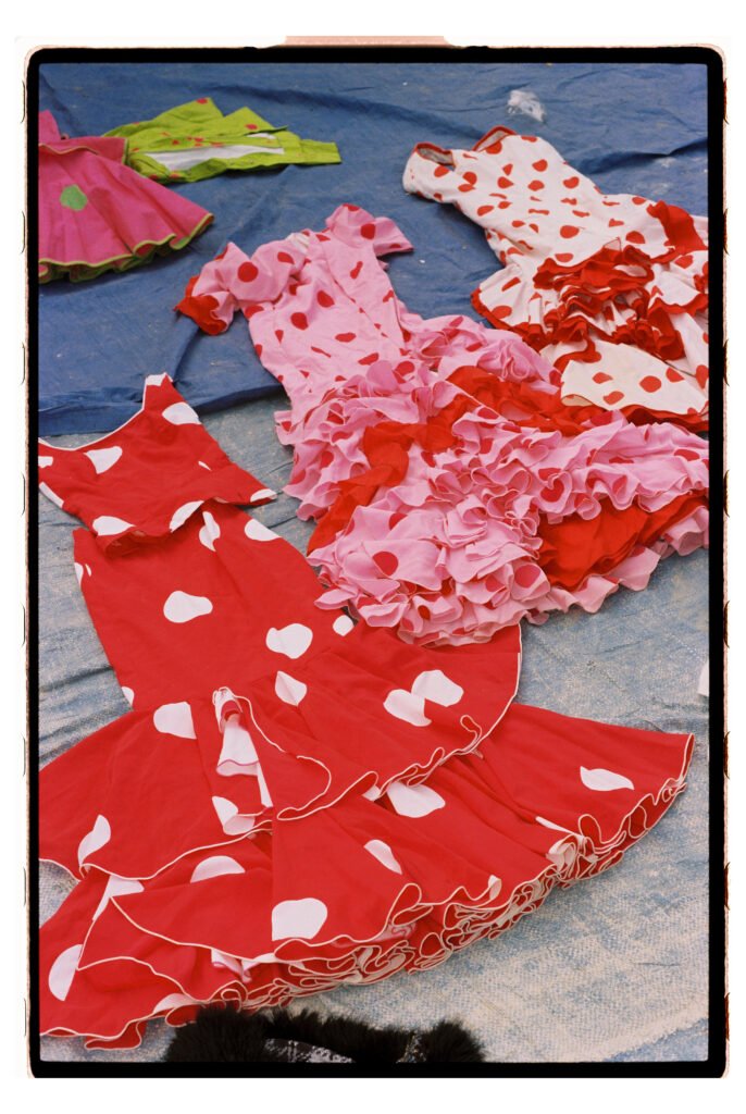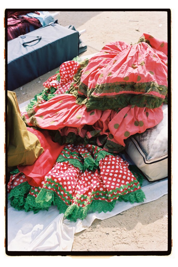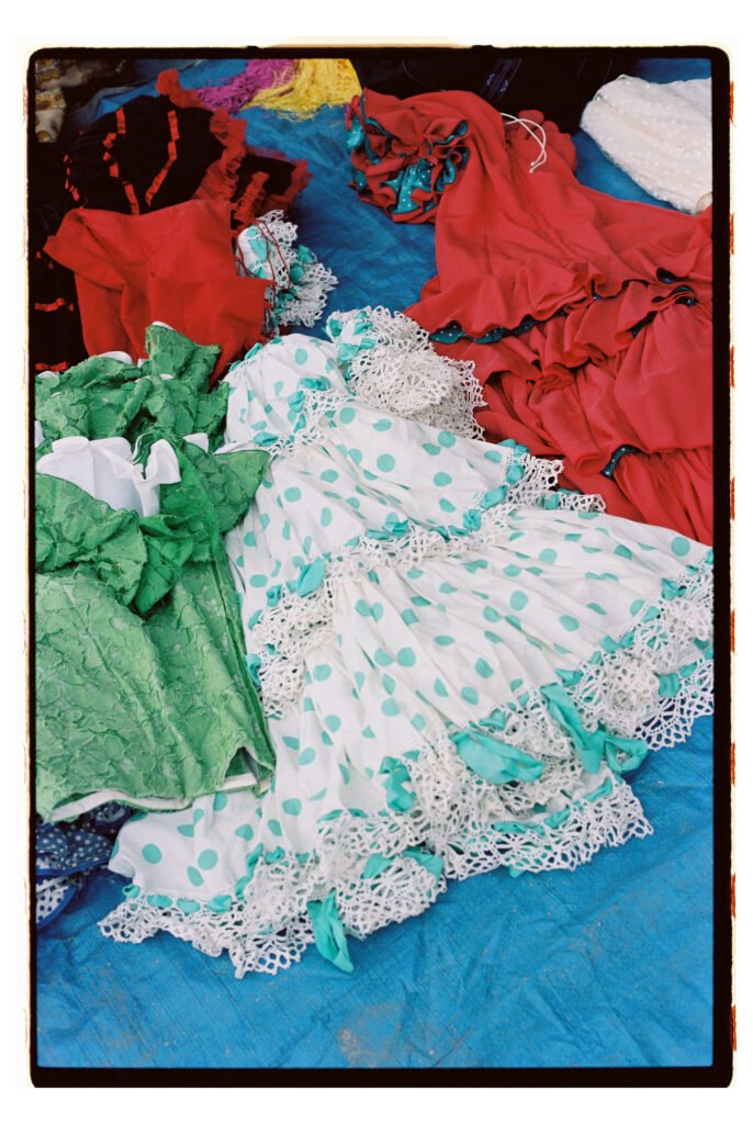 Un día, entre todo el desorden, empecé a fijarme – e instintivamente a fotografiar- los trajes de gitana que veía colgados o tirados en el suelo. No fue algo planeado, simplemente me gustó verlos ahí. Cuando vi los resultados, me encantó como lucían los colores y el volumen de los volantes con la luz dura del sur.