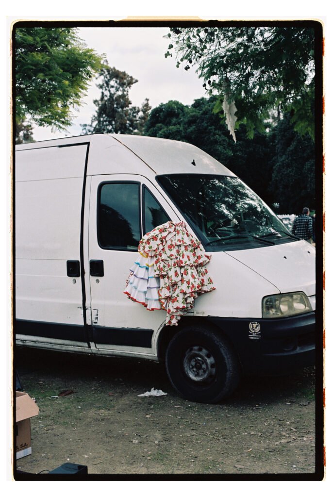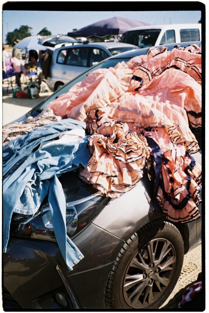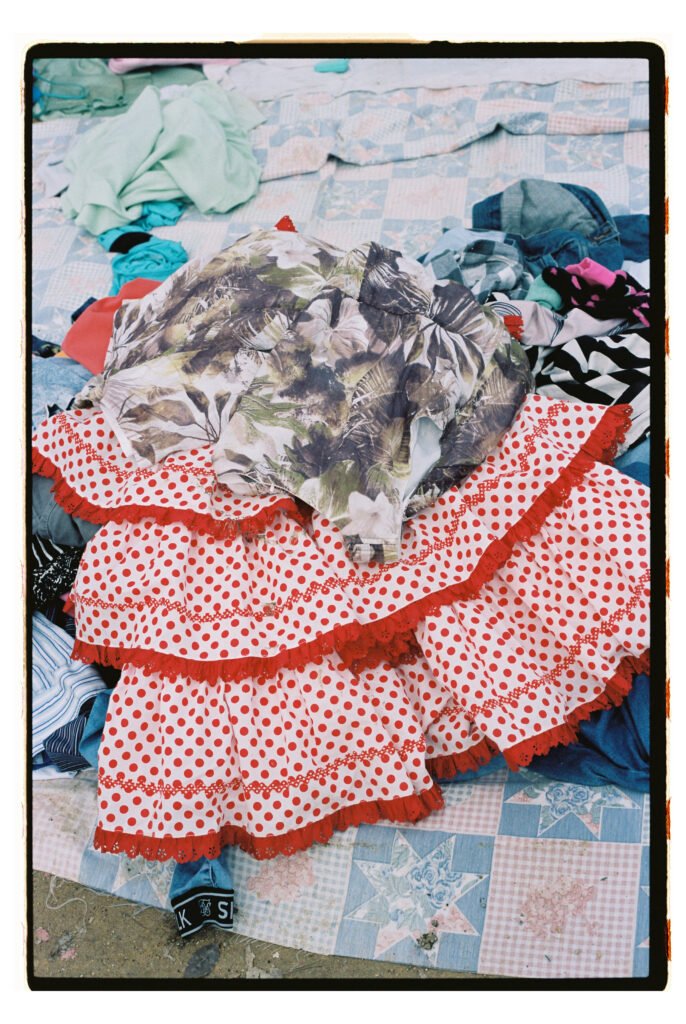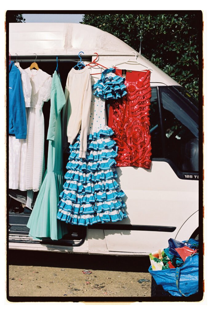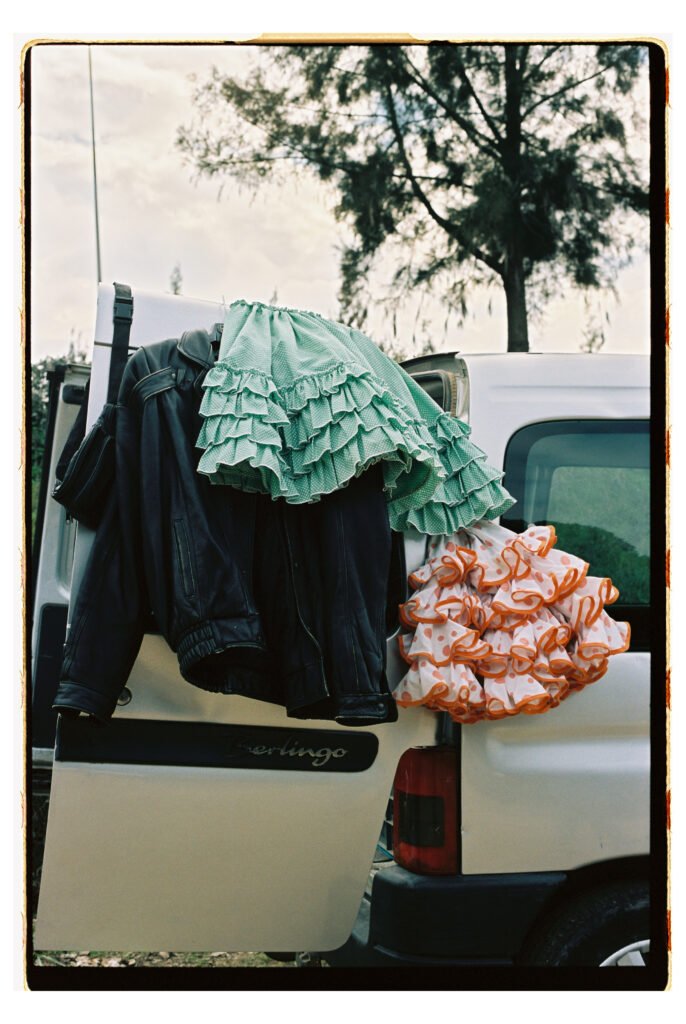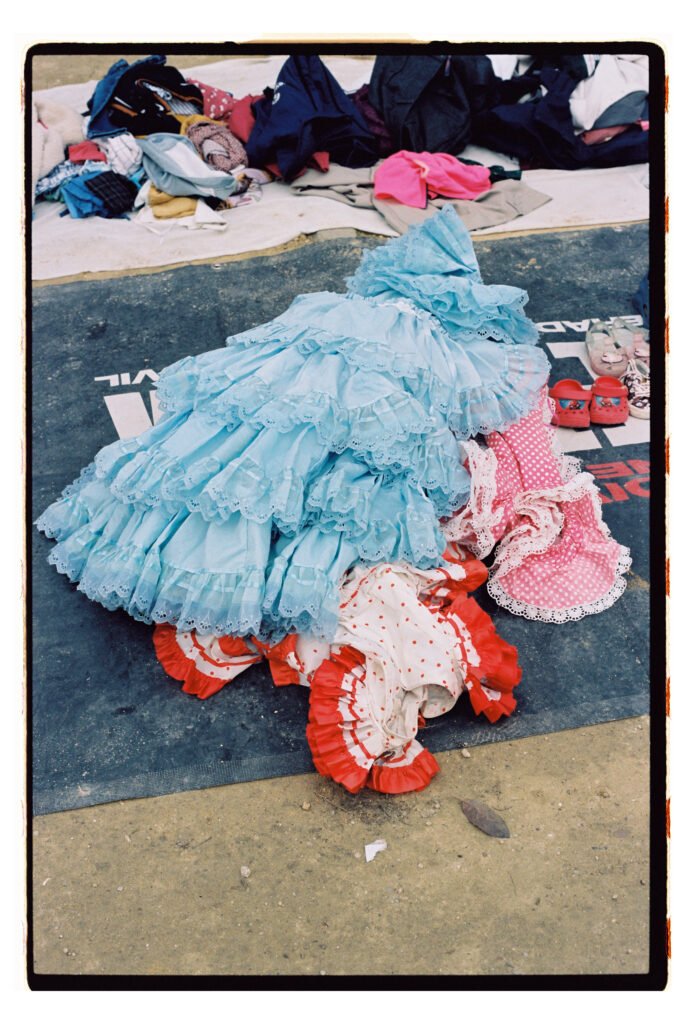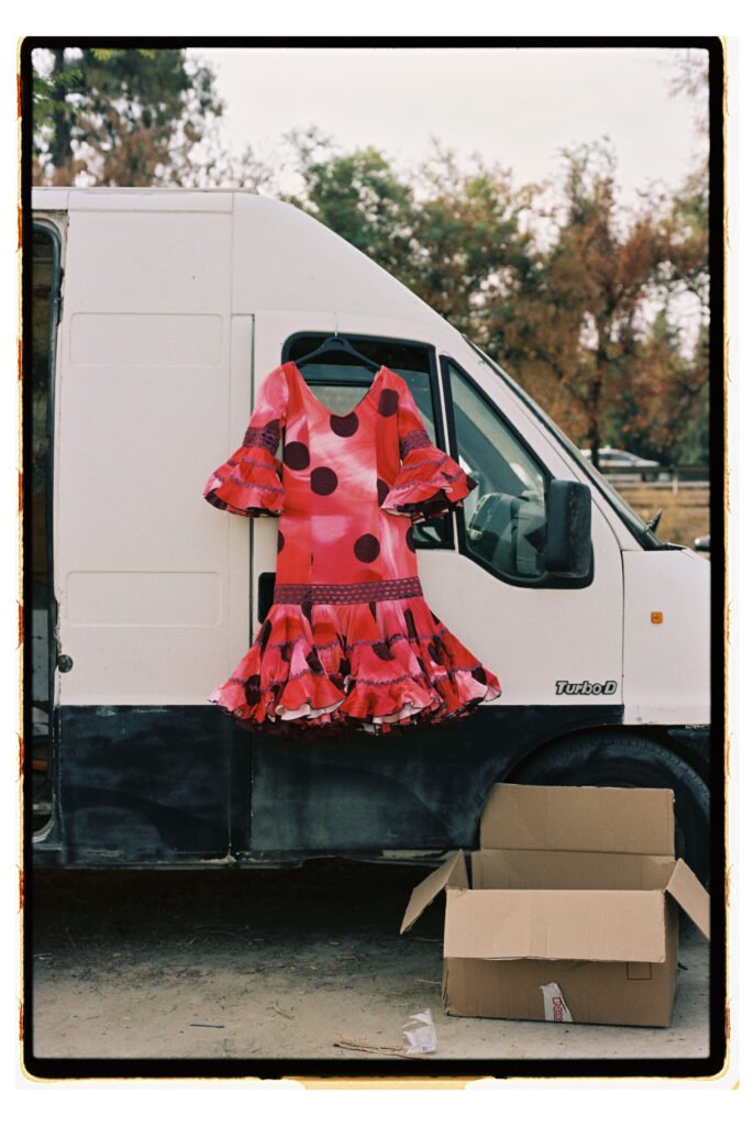 Un día, entre todo el desorden, empecé a fijarme – e instintivamente a fotografiar- los trajes de gitana que veía colgados o tirados en el suelo. No fue algo planeado, simplemente me gustó verlos ahí. Cuando vi los resultados, me encantó como lucían los colores y el volumen de los volantes con la luz dura del sur.