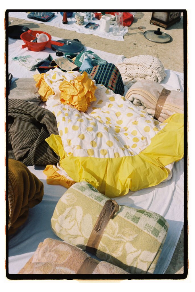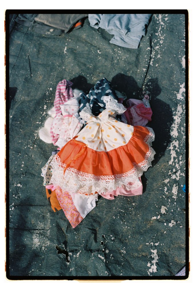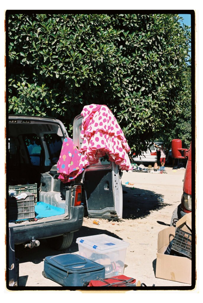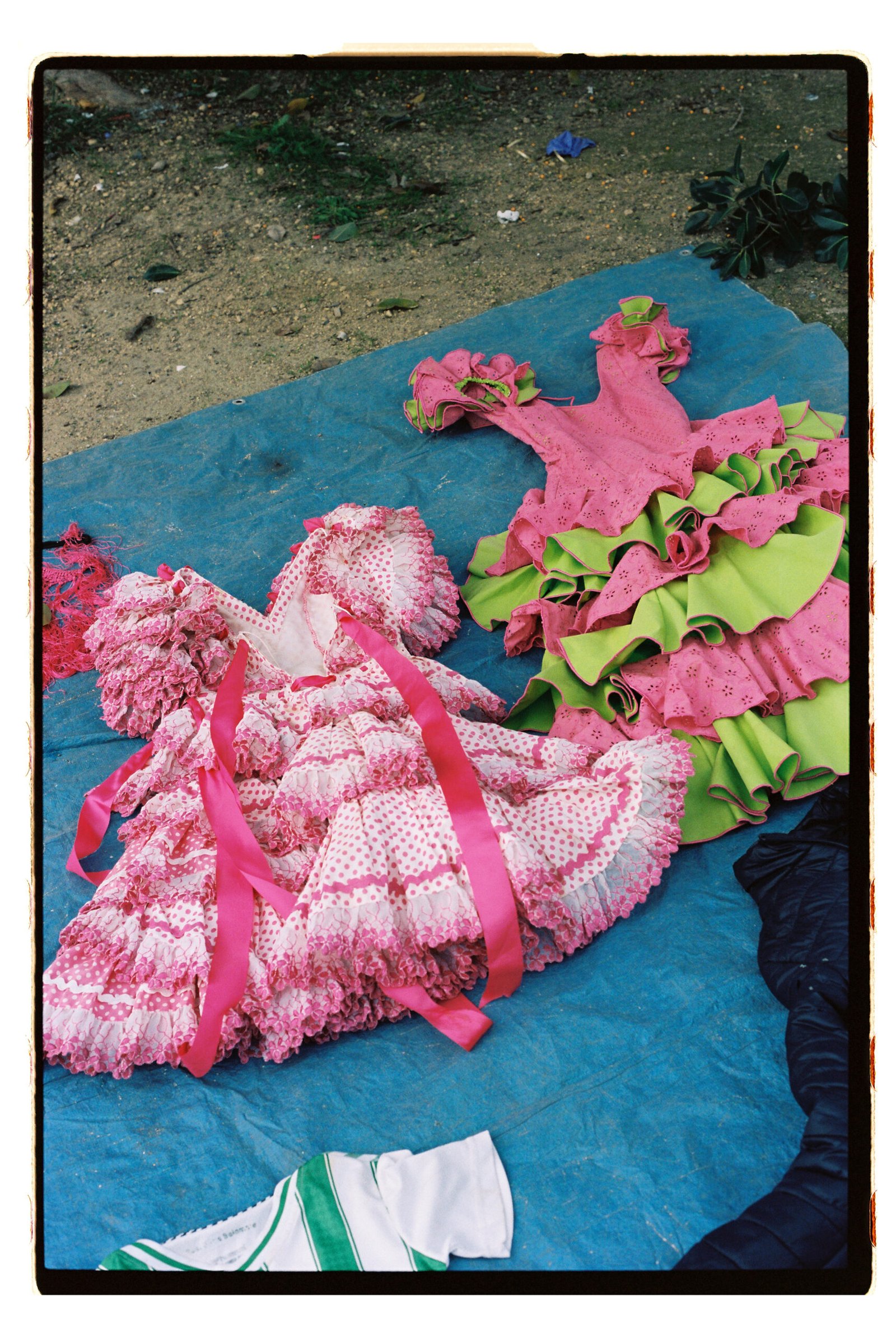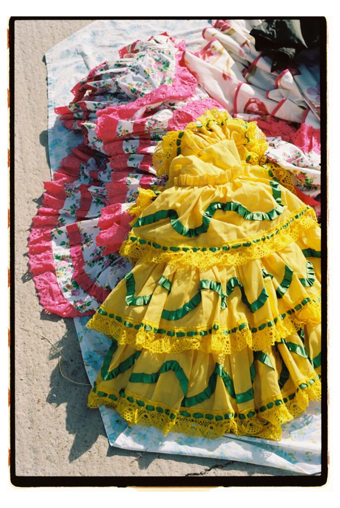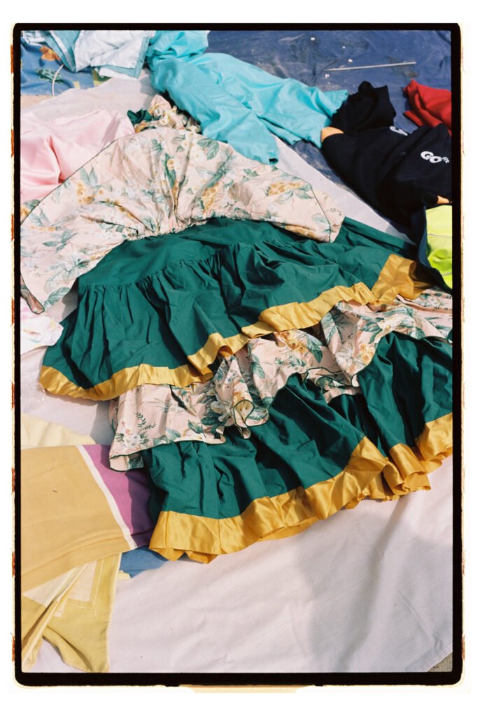 Un día, entre todo el desorden, empecé a fijarme – e instintivamente a fotografiar- los trajes de gitana que veía colgados o tirados en el suelo. No fue algo planeado, simplemente me gustó verlos ahí. Cuando vi los resultados, me encantó como lucían los colores y el volumen de los volantes con la luz dura del sur.